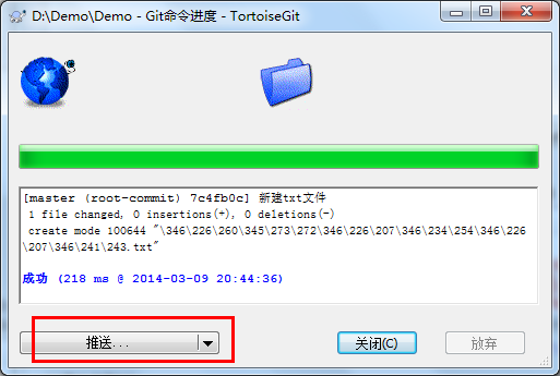 (10)add之后,我们就开始提交了,这边提交只是提交到本地,不像svn直接提交到服务器了,在提交之后需要点击下面的推送按钮,推送过程中输入用户名和密码就可以提交到服务器了。