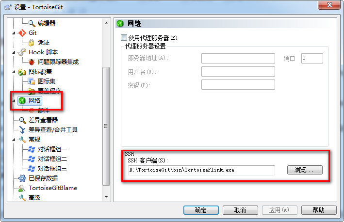 在TortoiseGit的Settings中找到Network,在下面的SSH client设置为TortoisePlink.exe,该文件在TortoiseGit安装目录下的bin文件夹里。