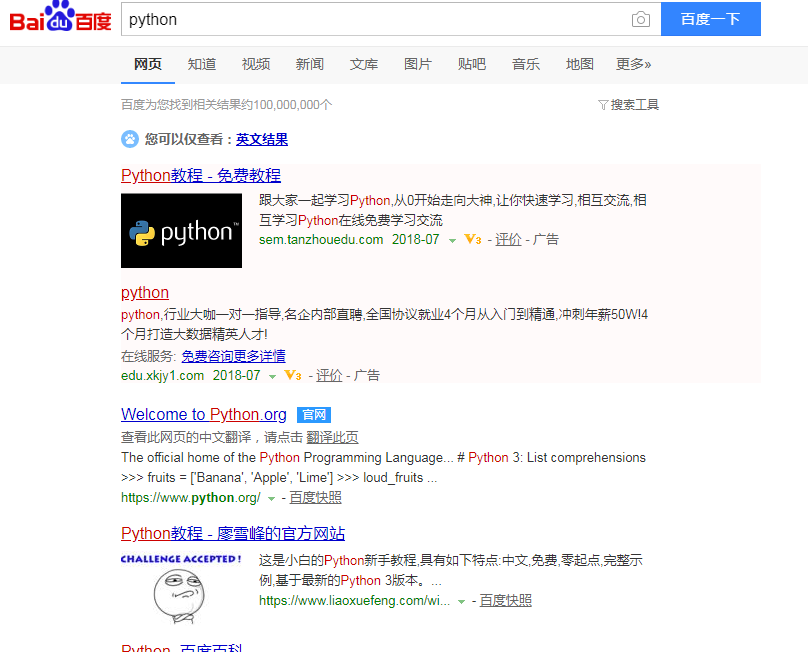 1 2 3 4 5 6 7 8 9 10 11 12 13 14 15 16 17 18 19 20 21 22 23 24 25 26 27 28 29 30 31 32 33 34 35 36 37 38 39 40 41 42 43 44 45 46 47 48 49 50 51 52 53 54 55 56 57 58 59 60 61 62 63 64 65 66 67 68 69 70 71 72 73 74 # 导入 webdriver from selenium import webdriver import time # 要想调用键盘按键操作需要引入keys包 from selenium.webdriver.common.keys import Keys # 调用环境变量指定的PhantomJS浏览器创建浏览器对象 driver = webdriver.PhantomJS() # 如果没有在环境变量指定PhantomJS位置 # driver = webdriver.PhantomJS(executable_path="./phantomjs")) # get方法会一直等到页面被完全加载,然后才会继续程序, # 通常测试会在这里选择 time.sleep(2) driver.get("http://www.baidu.com") # # 获取页面名为 wrapper的id标签的文本内容 data = driver.find_element_by_id("wrapper").text # 打印数据内容 print(data) # 打印页面标题 "百度一下,你就知道" print(driver.title) # 生成当前页面快照并保存 driver.save_screenshot("index.png") # id="kw"是百度搜索输入框,输入字符串"长城" driver.find_element_by_id("kw").send_keys(u"长城") # id="su"是百度搜索按钮,click() 是模拟点击 driver.find_element_by_id("su").click() #time.sleep(2)这个时间表示服务器响应时间 # 获取新的页面快照 driver.save_screenshot("长城.png") # 打印网页渲染后的源代码 # print(driver.page_source) # 获取当前页面Cookie print(driver.get_cookies()) # # ctrl+a 全选输入框内容driver.find_element_by_id("kw").send_keys(Keys.CONTROL,'a') # driver.save_screenshot("长城a.png") # # ctrl+x 剪切输入框内容 driver.find_element_by_id("kw").send_keys(Keys.CONTROL,'x') # 输入框重新输入内容 driver.find_element_by_id("kw").send_keys(u"python") driver.save_screenshot("a1.png") # 模拟Enter回车键 # time.sleep(10) #加个延时,不然可能会报错: # Element is not currently interactable and may not be manipulated # driver.find_element_by_id("su").send_keys(Keys.RETURN) #注意:这个地方用回车是没有效果的,因为输入框在表单当中, # 可以使用表单提交完成请求driver.find_element_by_id("su").submit() time.sleep(2) driver.save_screenshot("a3.png") 执行效果如下图所示 # # 清除输入框内容driver.find_element_by_id("kw").clear() # # # # 生成新的页面快照 driver.save_screenshot("ziyi.png") # 获取当前url print(driver.current_url) # 关闭当前页面,如果只有一个页面,会关闭浏览器 # driver.close() # 关闭浏览器 driver.quit()