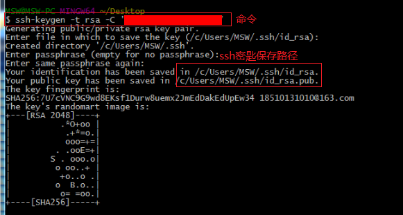1.配置gitbash和github的通信协议 ,输入ssh-keygen –t rsa –C “邮箱地址” 然后一直按回车回车回车回车。。。。箭头指向的邮箱填写我当时填的是和github上写的邮箱一致。