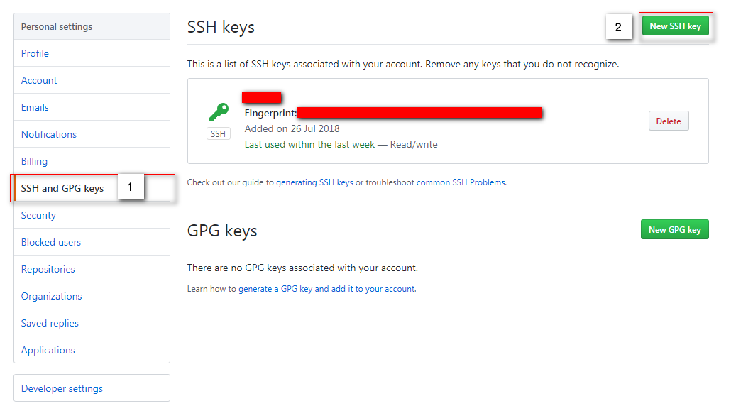 将本机的ssh秘钥添加到个人账户中,打开github自己的主页Settings->SSH->newSSHkey 步骤如下图: