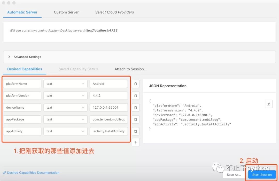 1 2 3 4 5 6 7 desired_caps = { "platformName": "Android", "platformVersion": "4.4.2", "deviceName": "127.0.0.1:62001", "appPackage": "com.tencent.mobileqq", "appActivity": ".activity.InstallActivity" }