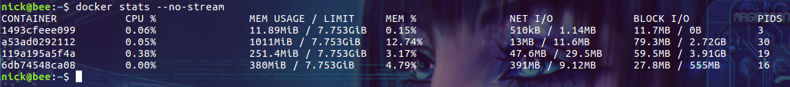 1 | $ docker stats --no-stream |