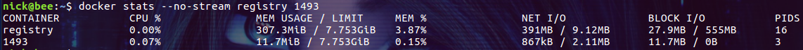 1 | $ docker stats --no-stream registry 1493 |