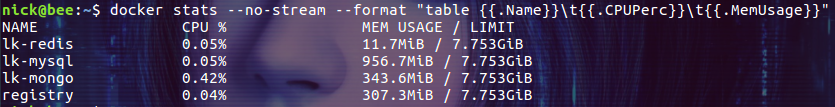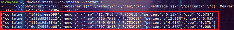 1 | $ docker stats --no-stream --format \ |