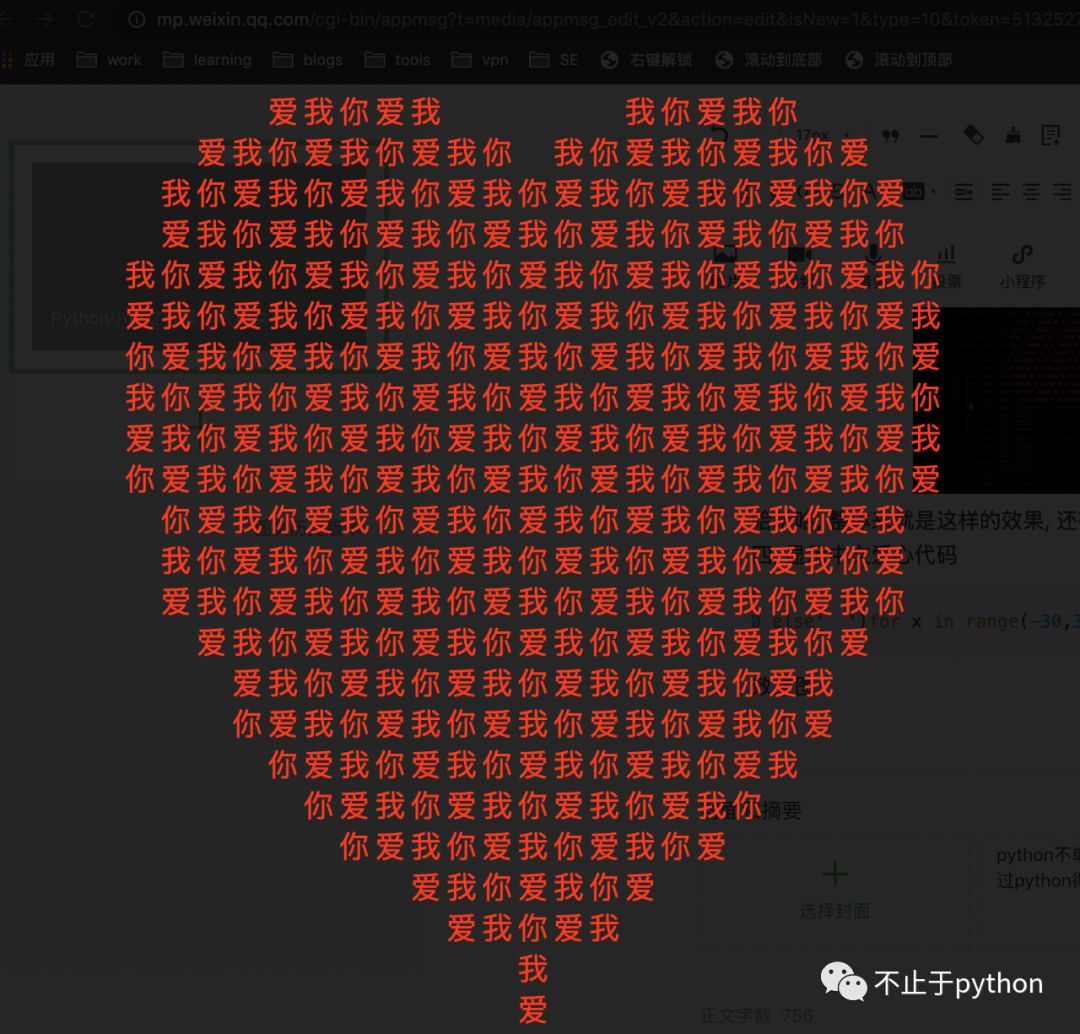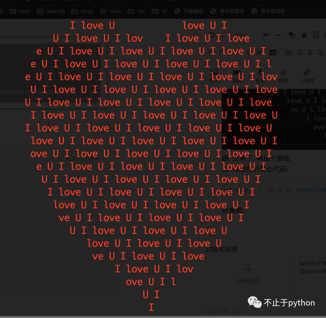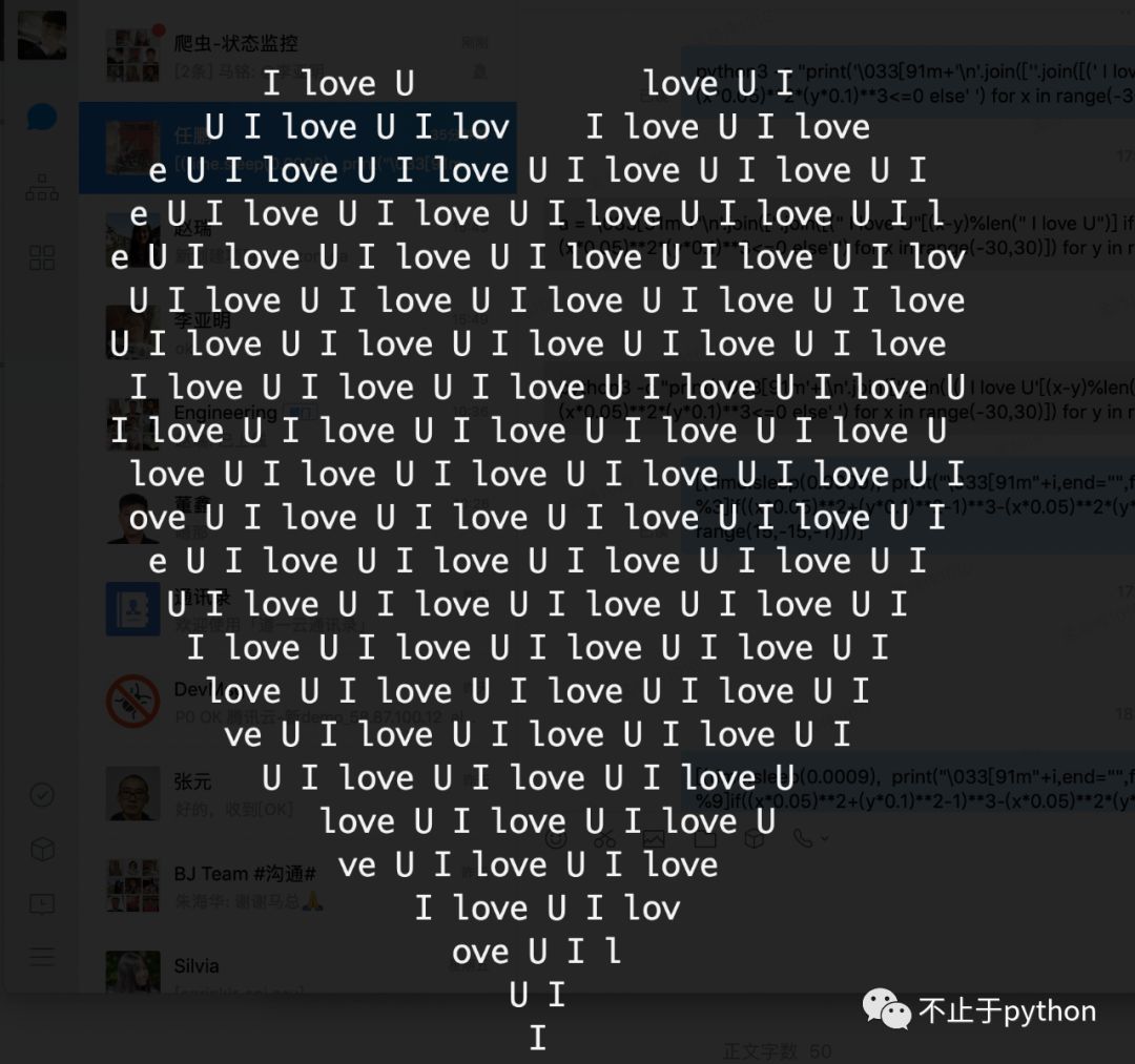 1 | python3 -c "import time; [(time.sleep(0.0009), print('\033[91m'+i,end='',flush=True)) for i in ('\n'.join([''.join([(u'我爱你'[(x-y)%3]if((x*0.05)**2+(y*0.1)**2-1)**3-(x*0.05)**2*(y*0.1)**3<=0 else' ')for x in range(-30,30,2)])for y in range(15,-15,-1)]))]" |