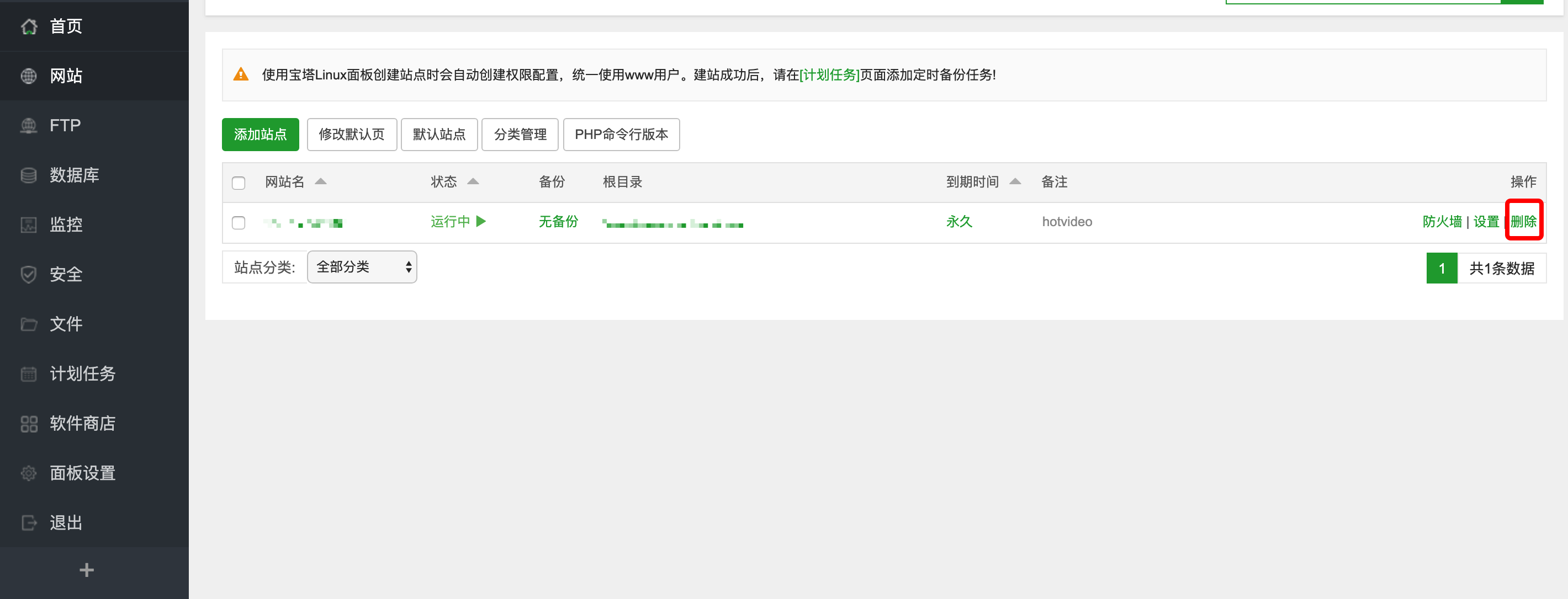 登录到宝塔控制面板 –> 网站 –> 找到已经创建的网站, 一键删除即可