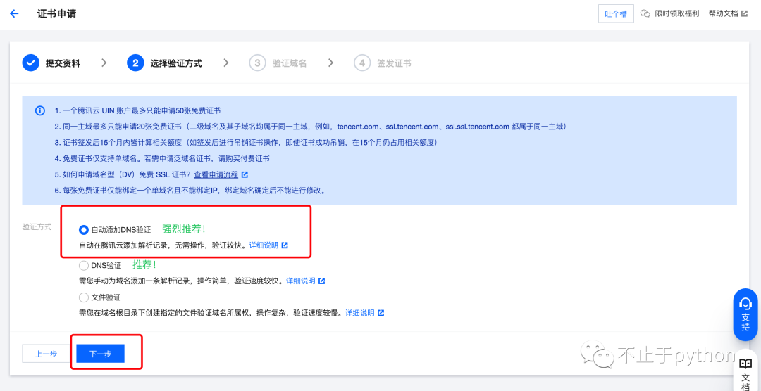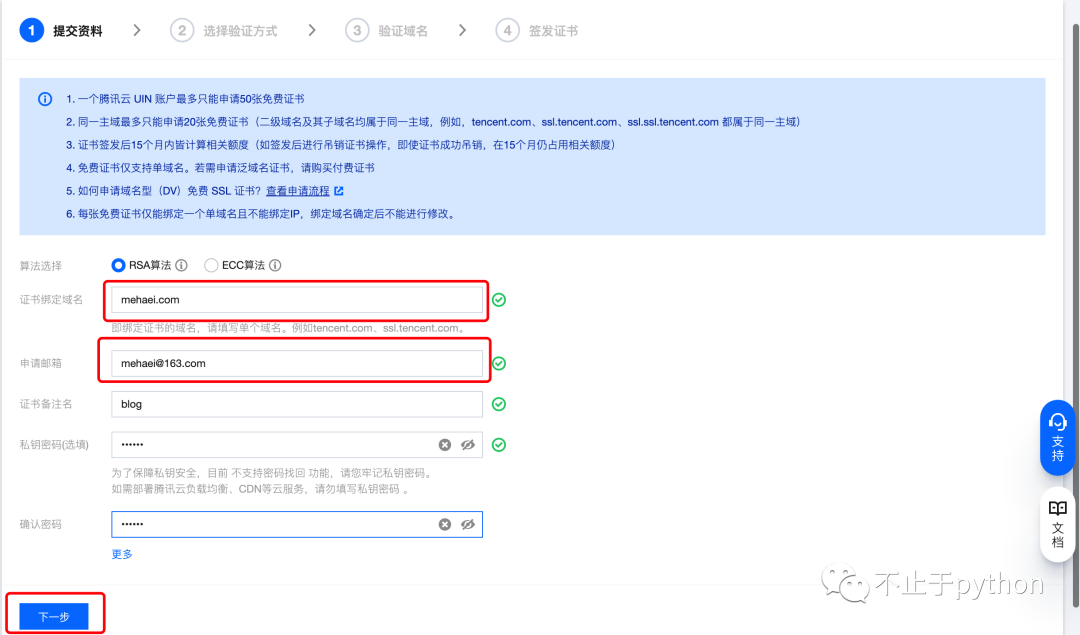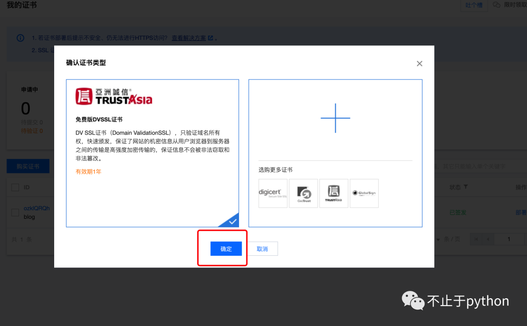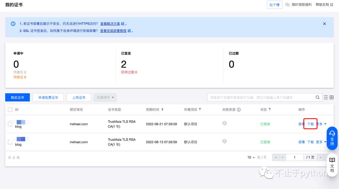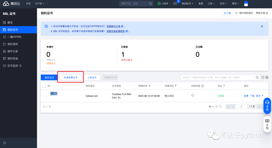 - 登录 SSL证书管理控制台–> 我的证书 –> 申请免费证书