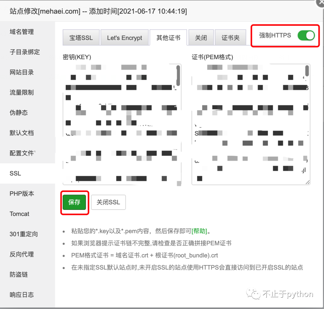 - 点击SSL -> 其他证书 -> 填入密钥和证书 -> 点击强制HTTPS -> 点击保存