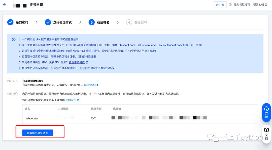 5. 查看域名验证状态(一般稍等几分钟就可以验证成功)
