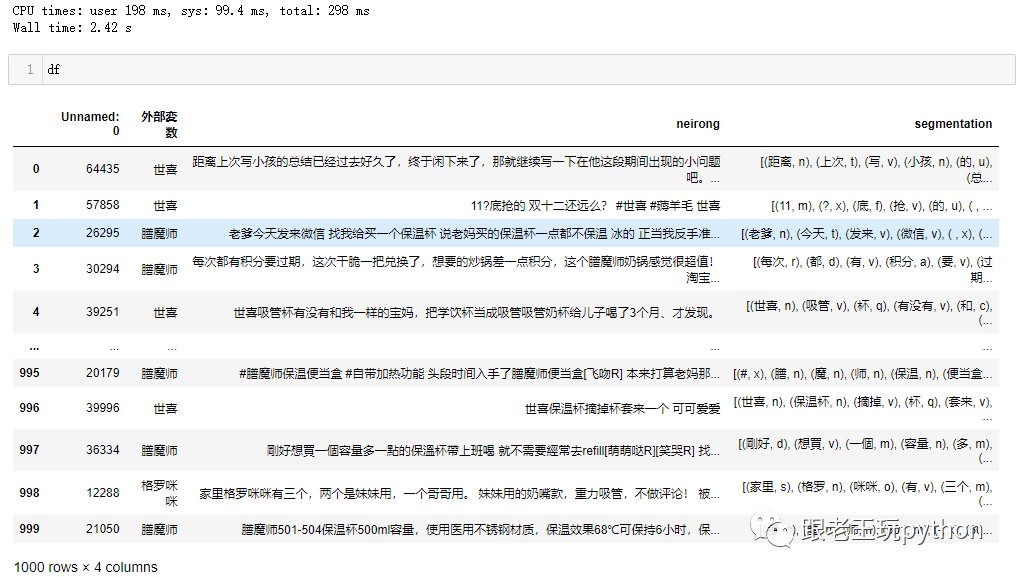 可以看到segmentation 已经分词完成,词性也对应上了,通过上面这种方案处理1000条数据用了2.42秒。处理的数据越多,差异越明显。