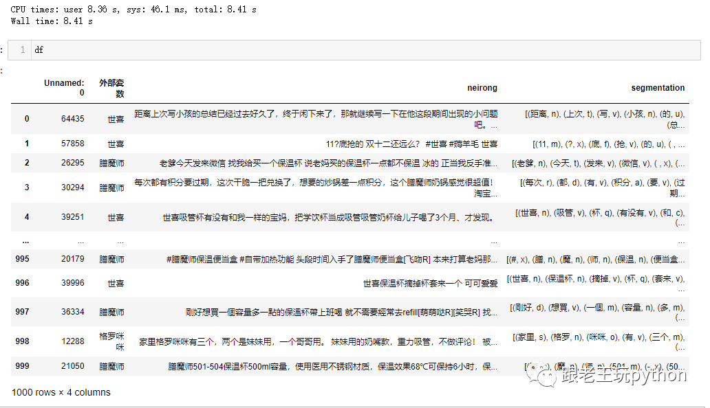 可以看到segmentation 已经分词完成,词性也对应上了,通过上面这种方案处理1000条数据用了8.41秒。