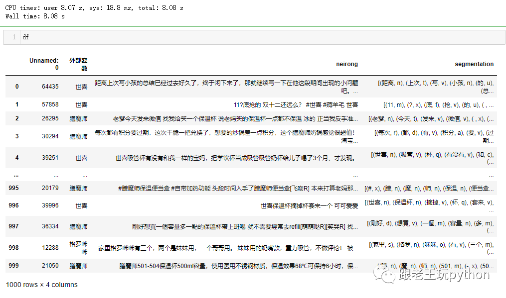 可以看到segmentation 已经分词完成,词性也对应上了,通过上面这种方案处理1000条数据用了8.08秒。