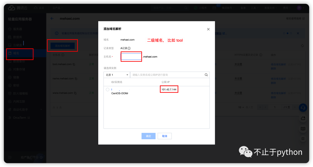 登录腾讯云控制台 - 到服务器管理中 - 域名 - 添加域名解析 - 进行以下操作