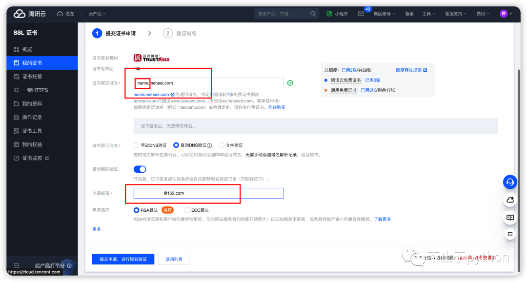 其它步骤都相同, 只是填写申请时绑定域名一定要写到二级域名, 因为免费版的ssl证书不支持*.mehaei.com(泛指定)域名, 审核大概几分钟就通过了