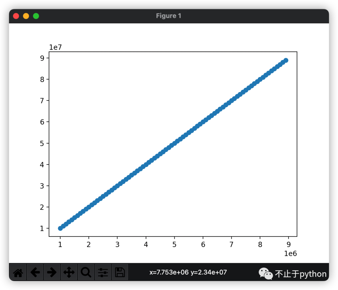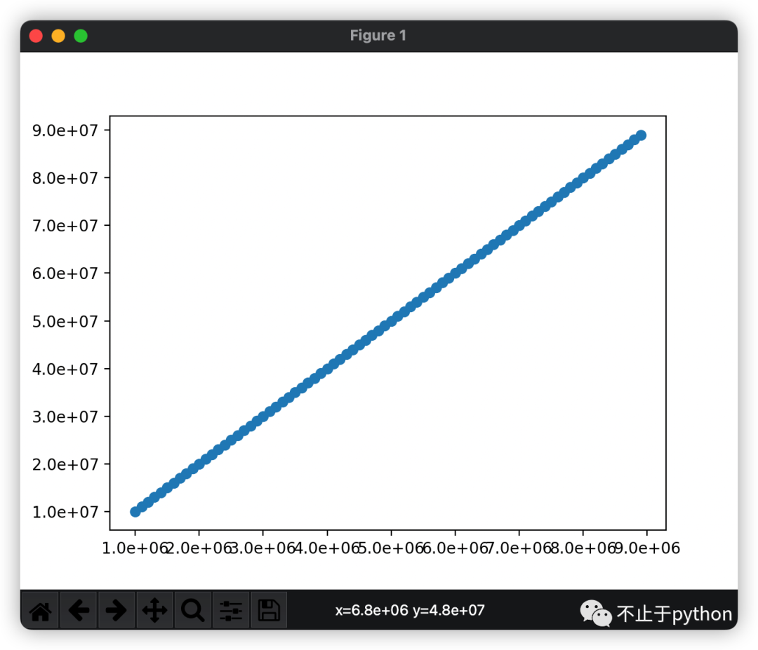 1 | import matplotlib.pyplot as pltfrom matplotlib.ticker import FuncFormatterdef formatnum(x, pos): return "{:.1e}".format(x)formatter = FuncFormatter(formatnum)def main(): x = range(1000000, 9000000, 100000) y = range(10000000, 90000000, 1000000) plt.scatter(x, y) plt.gca().yaxis.set_major_formatter(formatter) plt.gca().xaxis.set_major_formatter(formatter) plt.show() |