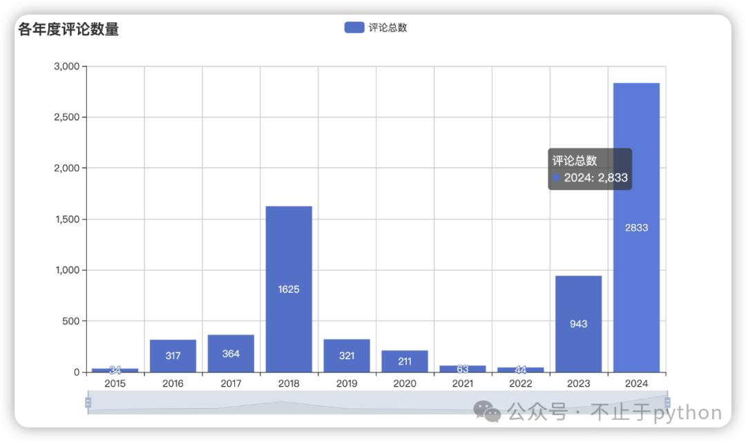 - 2018年后,评论数量大幅增加,2018年达到1625条,2024年截至目前评论数更是飙升至2833条,占比41.9%,为历年最高。