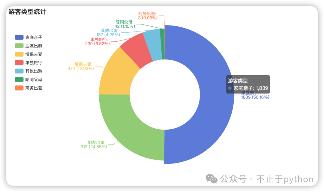 - 家庭亲子游占比最高(1839条,占比27.23%),其次是朋友出游(912条,占比13.51%)和情侣夫妻(474条,占比7.02%)。